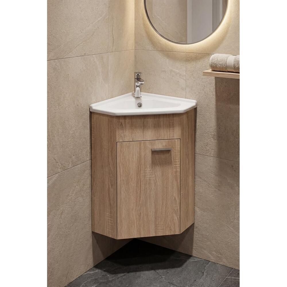 Eckwaschtisch aus weißer Keramik passend zum Zoja Badmöbelunterschrank .